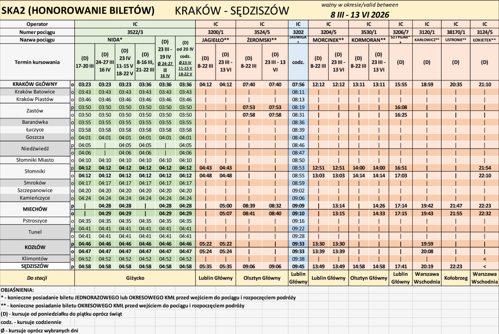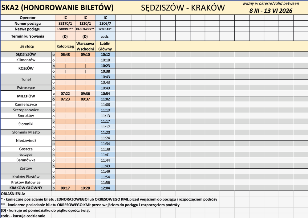 - Niektóre pociągi PKP Intercity, wskazane w powyższej tabeli mają zaplanowane dodatkowe postoje handlowe na wybranych stacjach (Zastów, Słomniki, Kozłów).