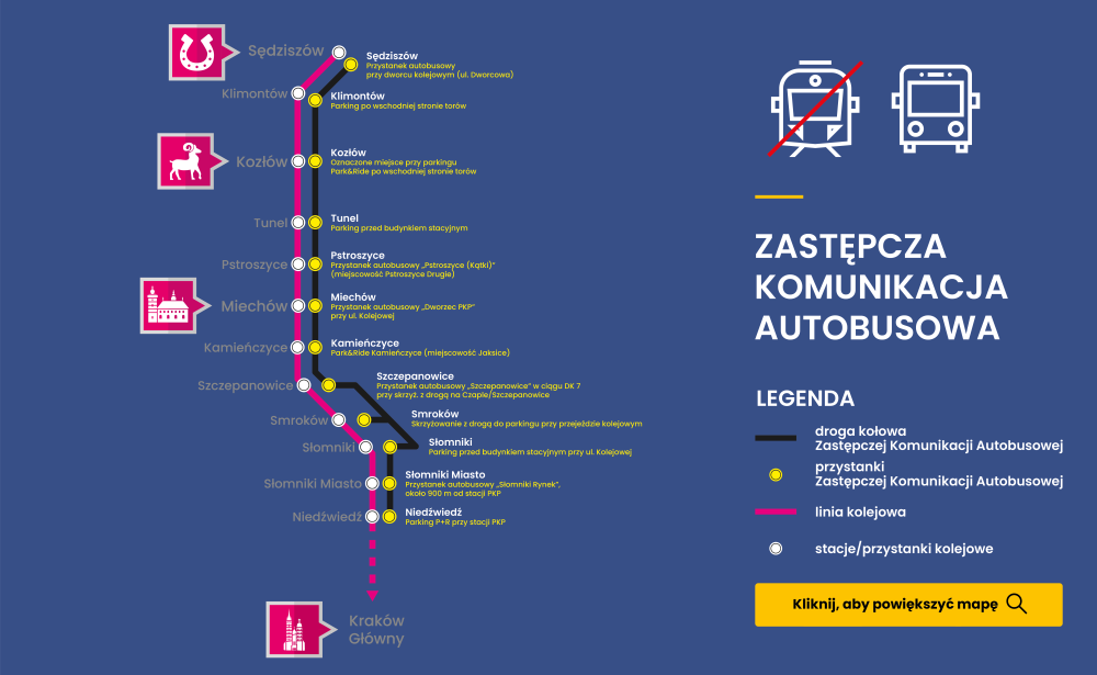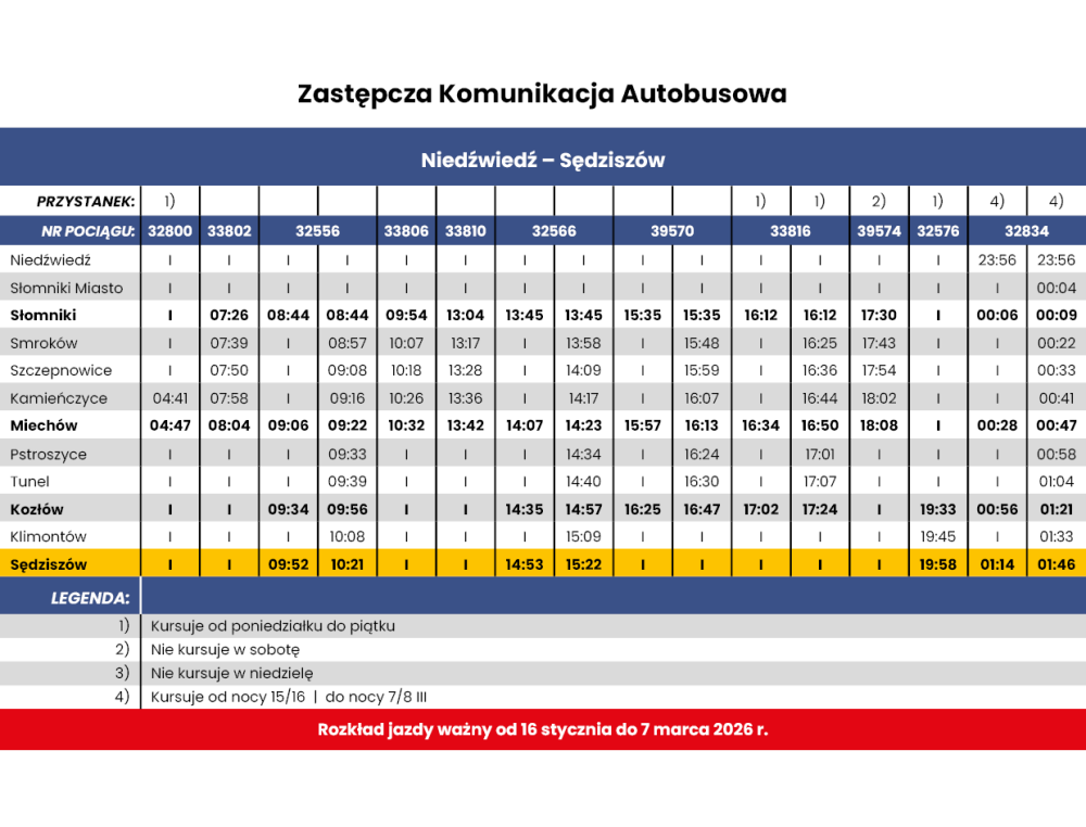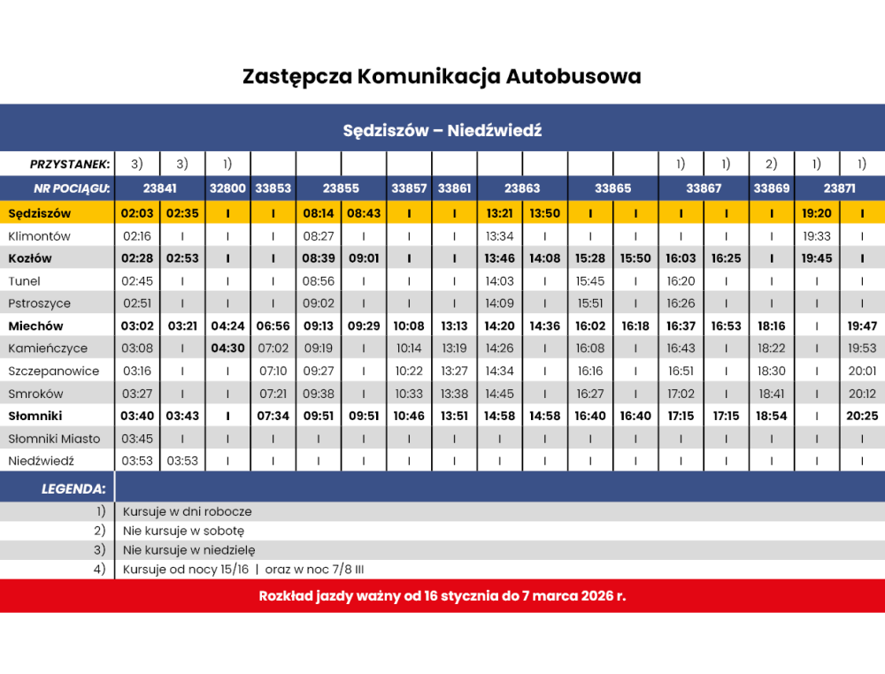 -> w dniach od 16 stycznia 2026 r. do 7 marca 2026 r. na trasie SKA2 na odcinku Sędziszów - Niedźwiedź